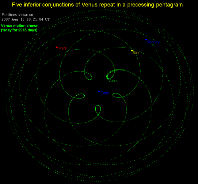 Esse fenômeno segue um padrão que desenha no céu um pentagrama, unindo os pontos de encontro entre Sol e Vênus. O pentagrama é um símbolo sagrado em diversas culturas e representa os quatro elementos coordenados pelo Espírito.
